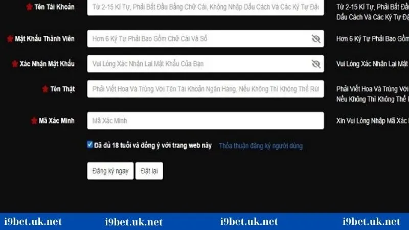 - Chưa đồng ý với các điều khoản: Anh em cần tích vào ô đồng ý với các điều khoản sử dụng của i9bet để hoàn tất quá trình đăng ký.